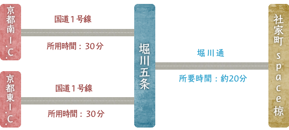 京都市内の堀川通を北上いただき、御薗橋を渡ってください。