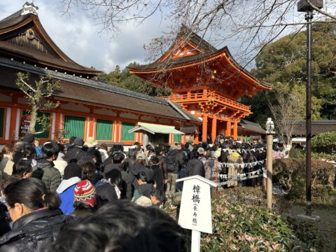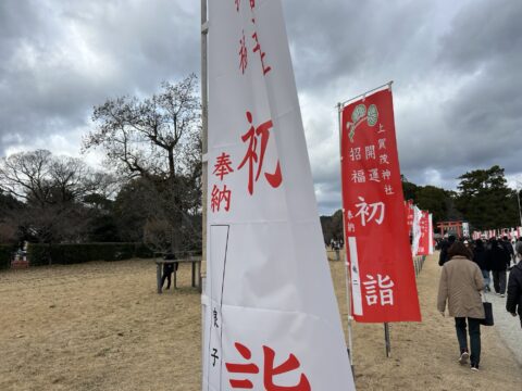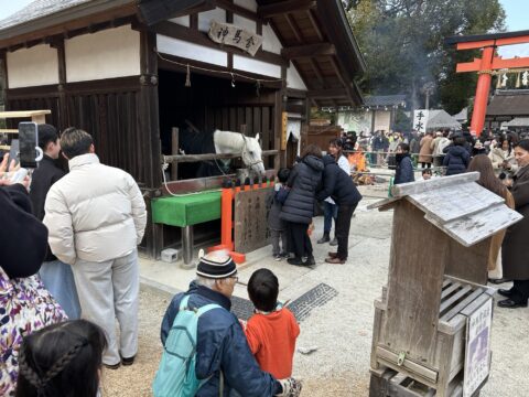 今年の元旦は、一時雹のようなものが降りましたが、ほぼ晴れの過ごし易い一日になりました。上賀茂神社は今まで経験した事が無い程の参拝者が初詣に来られていました。二の鳥居の手前から本堂までの長蛇で、午年という事もあり神馬との撮影も大賑わいでしたが、厄除大根炊きや厄除ぜんざいも凄い列で大人気でしたね。駐車場も満車で続く道も夕方まで渋滞して動かない状況でしたので、少し早い時間に来られる事をオススメします。