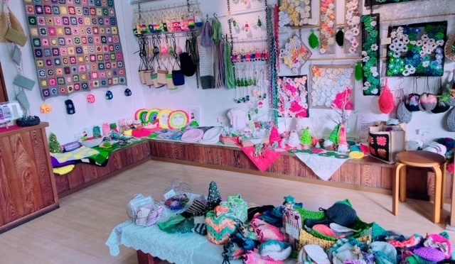 カラフルな毛糸に触れて、自由に編んだり結んだり。初めての方も大歓迎です。